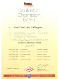Auf der internationalen Rassehunde-Ausstellung in Kassel 2006 bewertete Herr Schneider Ursus mit V1 und er erhielt den Tagestitel BOB. Er erhielt die Anwartschaften CAC, VDH und CACIB.